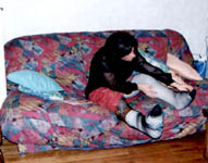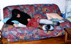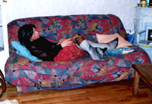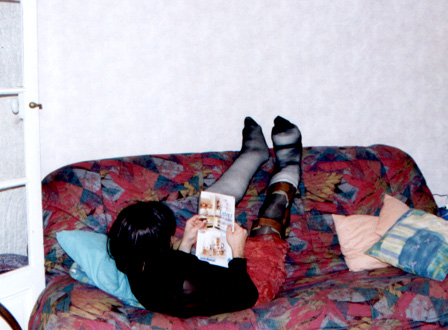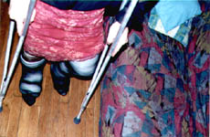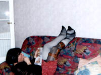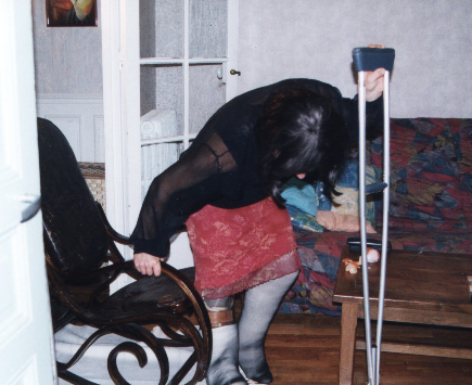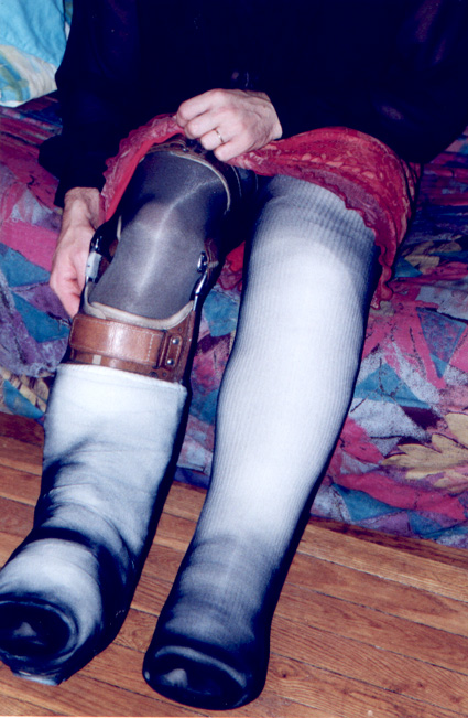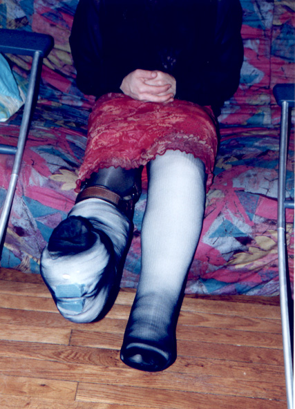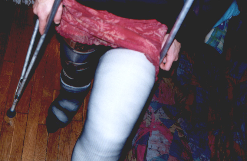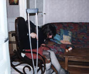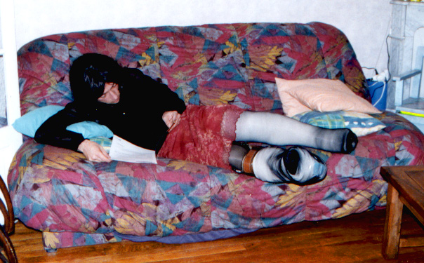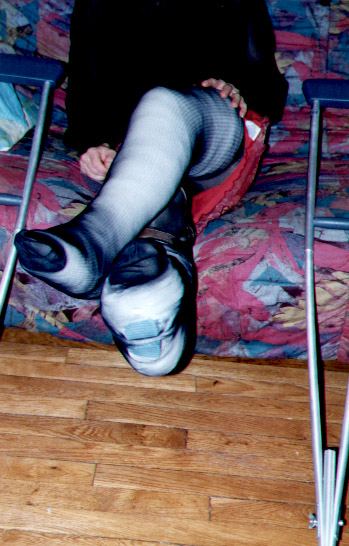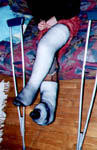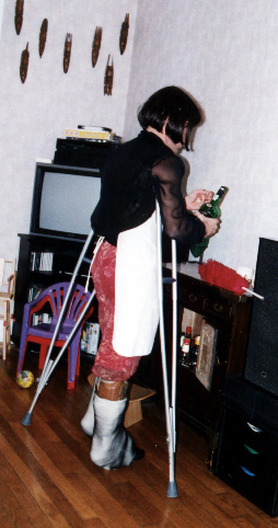 I took those pics last week, when my wife was working night. I didn't paid too much attention of my face, it was more for my fantasy than really to take pics. But I am affraid not to have enough pics. I have made a strange combination back in sept 99, of a cast over a brace. Since I love to reuse my casts, love to make them thick, and I didn't have Georgik saw, it took me 2 hours to cut it, in the middle of the night (I was working the next day).